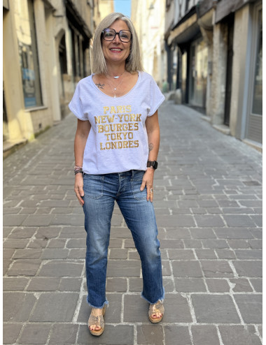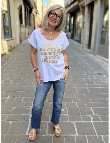 T shirt blanc/ paillettes or PARIS NEW YORK BOURGES TOKYO LONDRES