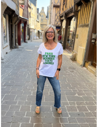 Tee shirt PARIS NEW YORK BOURGES TOKYO LONDRES paillettes vertes Anouk & Ninon