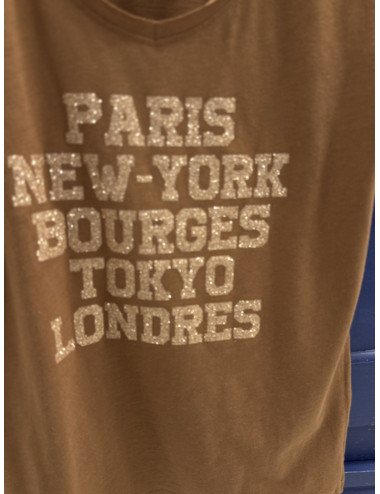 Paris New York Bourges Tokyo Londres , inscriptions paillettes camel